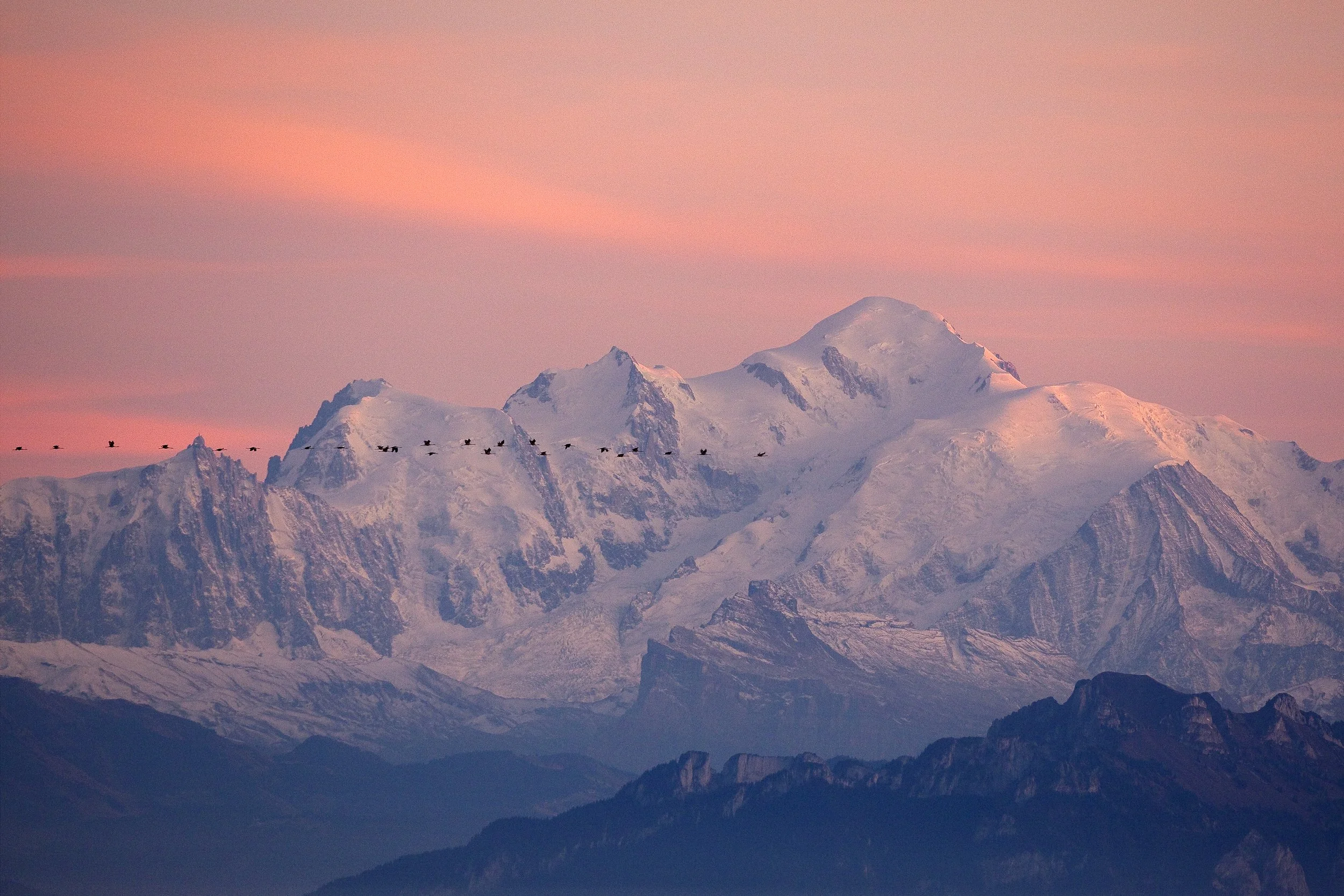 Un défilé de grues cendrées (Grus grus) devant le Mont Blanc. Voir "Histoires"