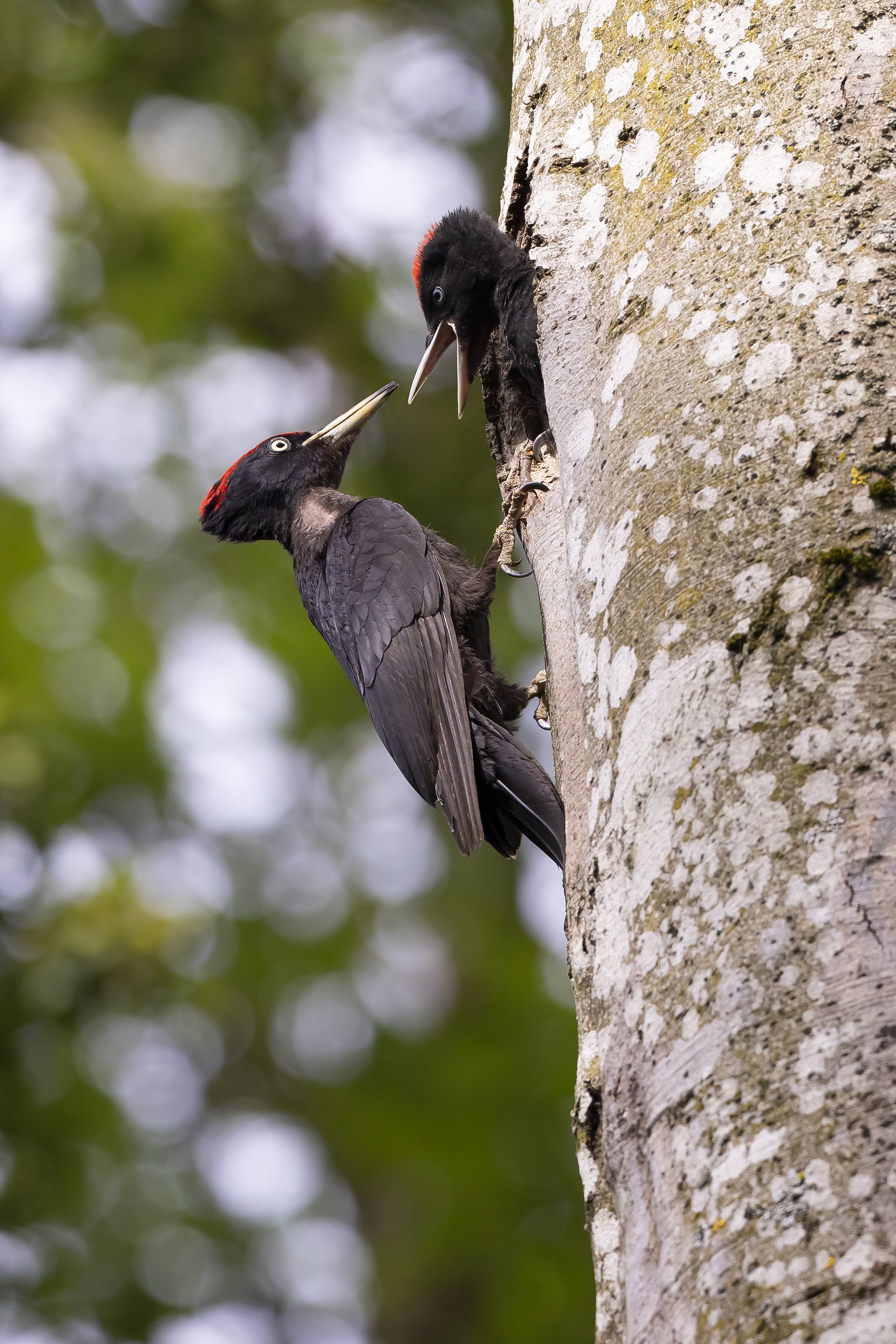 Le père Pic noir et son jeune mâle (Dryocopus martius)